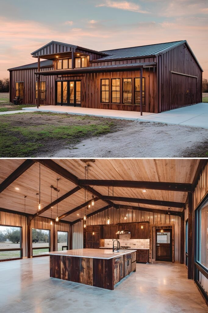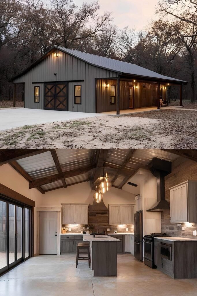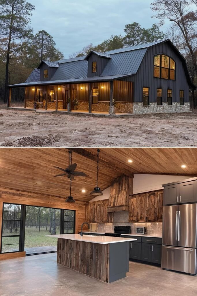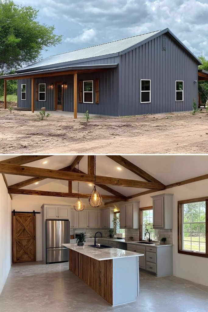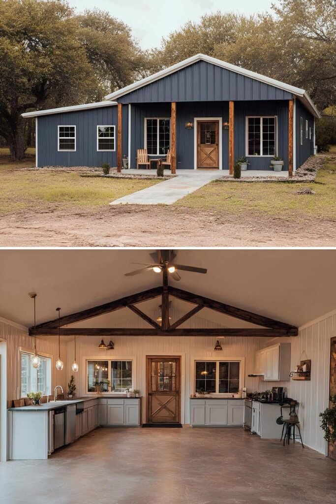 The interior of a well-executed barndominium doesn’t need to look like a bare metal box. The owners in this collection used a few repeating strategies that punched above their budget. Exposed steel posts and beams were left visible rather than drywalled — this reads as intentional industrial design, not unfinished construction. Polished concrete floors ran $3 to $6 per square foot installed and held up better than budget LVP over time.