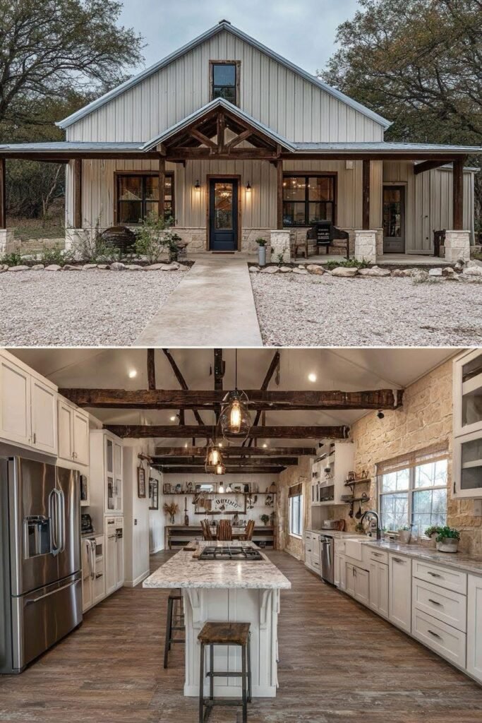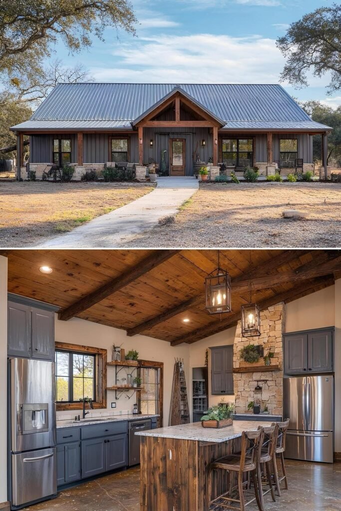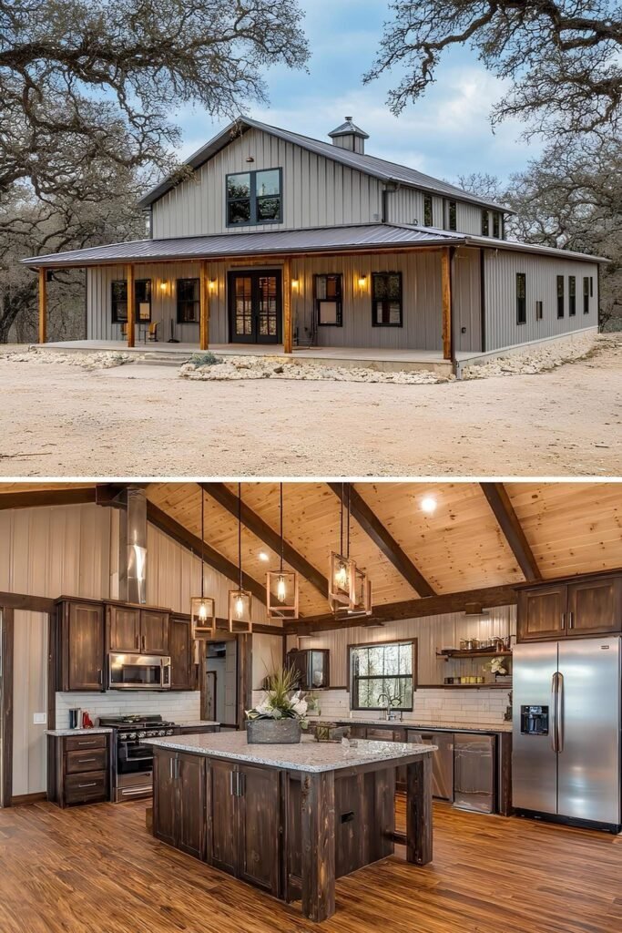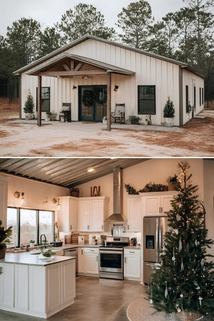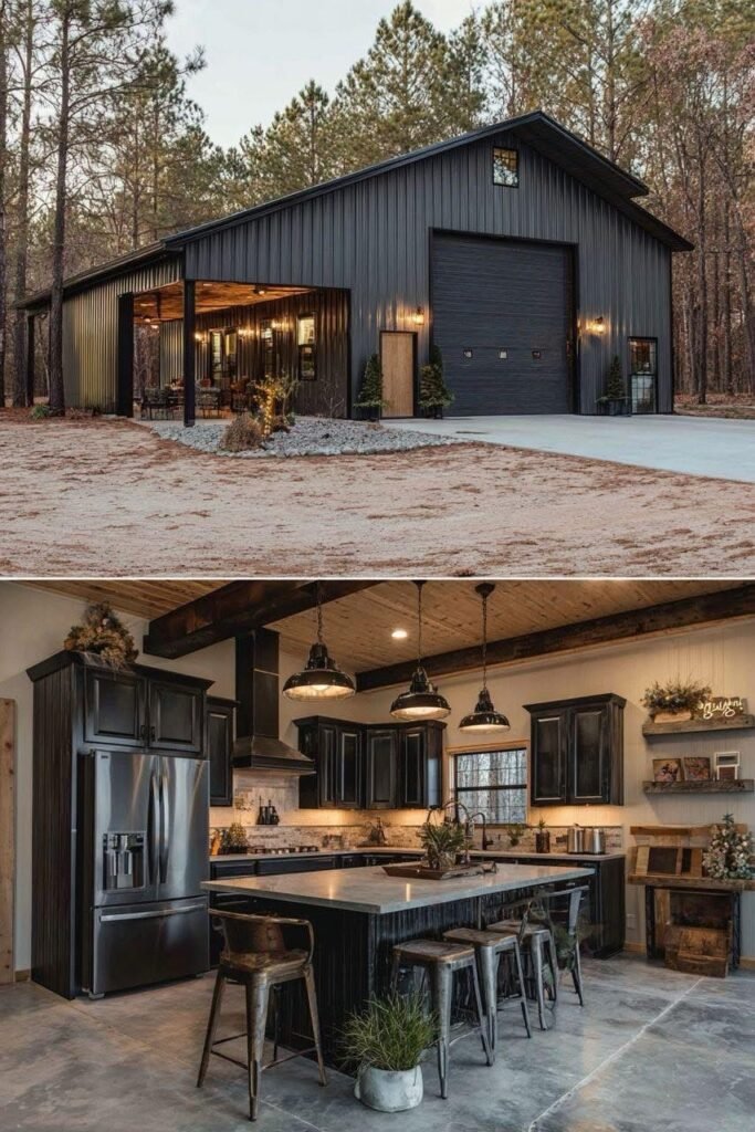 The interior of a well-executed barndominium doesn’t need to look like a bare metal box. The owners in this collection used a few repeating strategies that punched above their budget. Exposed steel posts and beams were left visible rather than drywalled — this reads as intentional industrial design, not unfinished construction. Polished concrete floors ran $3 to $6 per square foot installed and held up better than budget LVP over time.
