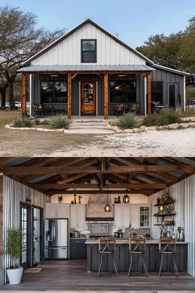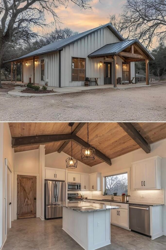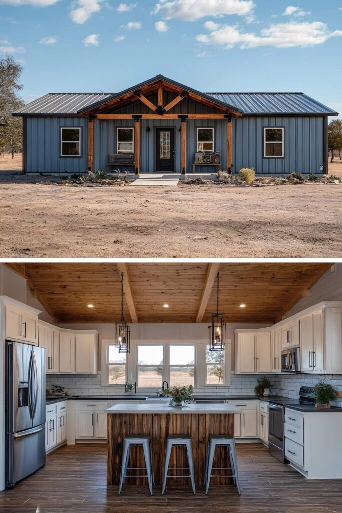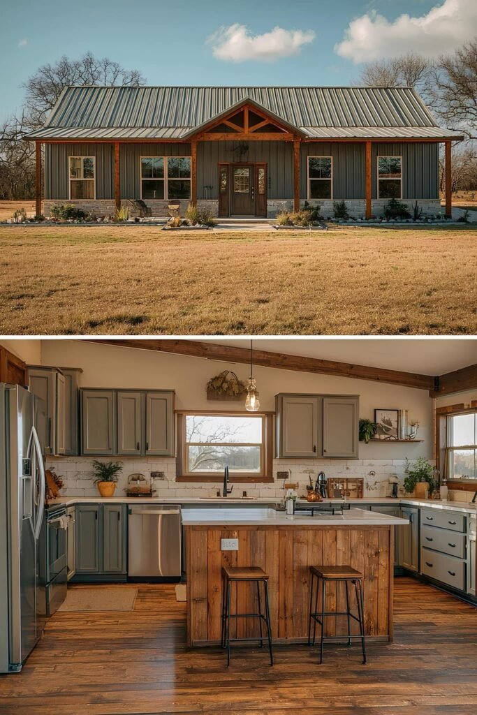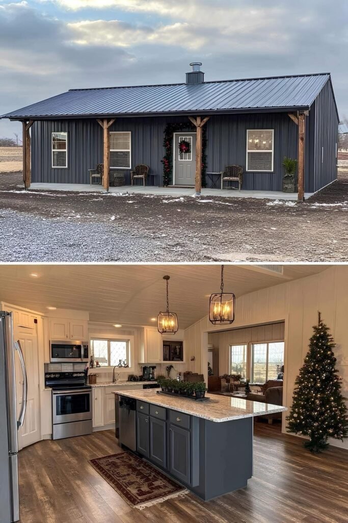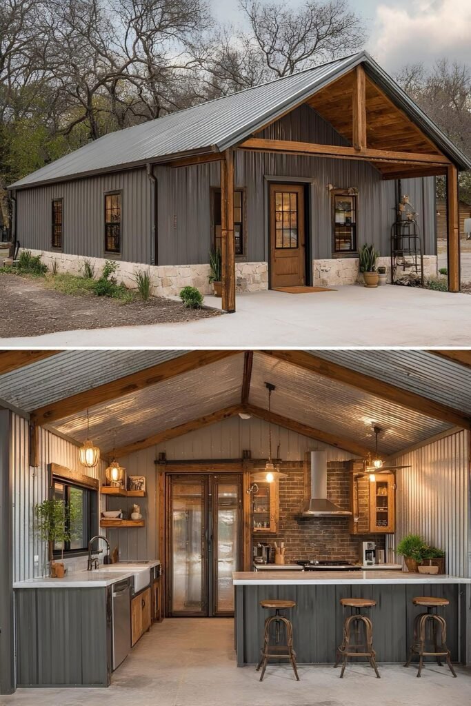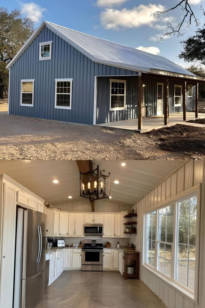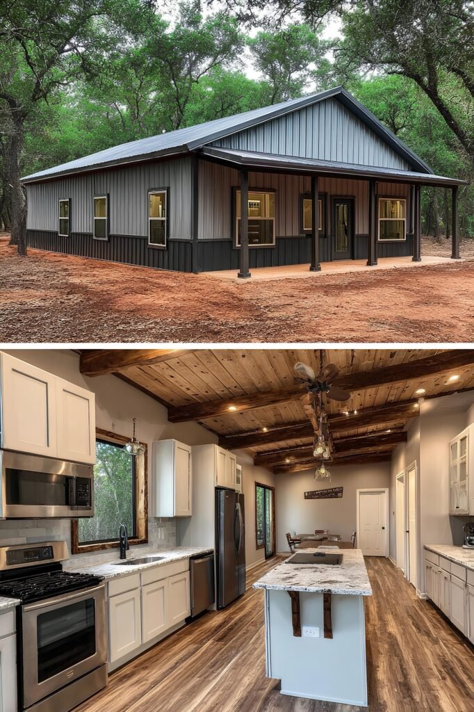 One approach that appears repeatedly in this collection is phased construction. The owner builds a functional core — one bedroom, one bath, kitchen, living area — within the original budget, then adds square footage or finishes as cash allows. Because metal buildings are engineered for expansion, adding a lean-to, a garage bay, or even a full addition is structurally straightforward compared to stick-frame.