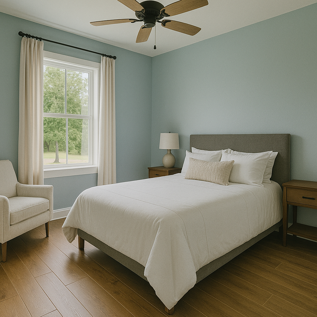 This is our oldest daughter’s room. She picked the wall color — a soft gray-blue — and made herself a little reading spot by the window. It’s a calm space that gets great afternoon light, and she loves having it all to herself.