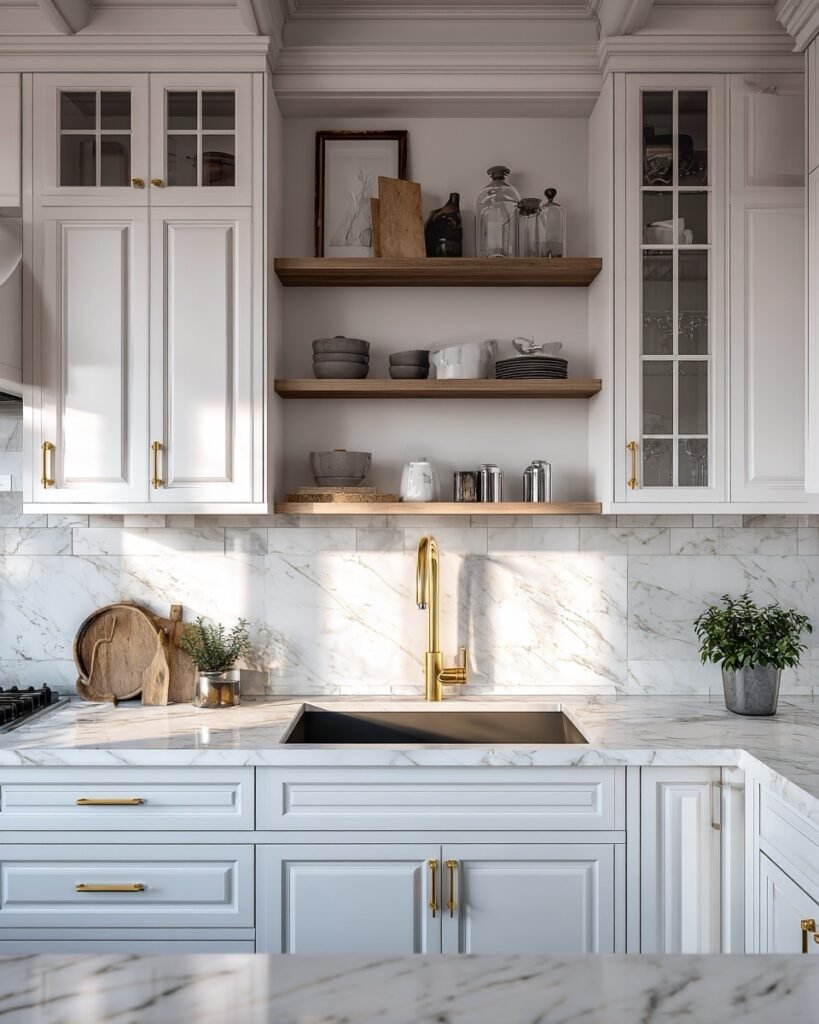 Step inside and the first thing you see is the kitchen — bright, neat, and made for real life. White cabinets, open wood shelves, and a warm gold faucet make it feel both modern and homey. “I didn’t want a big kitchen,” Laura said. “I just wanted one that worked.”
