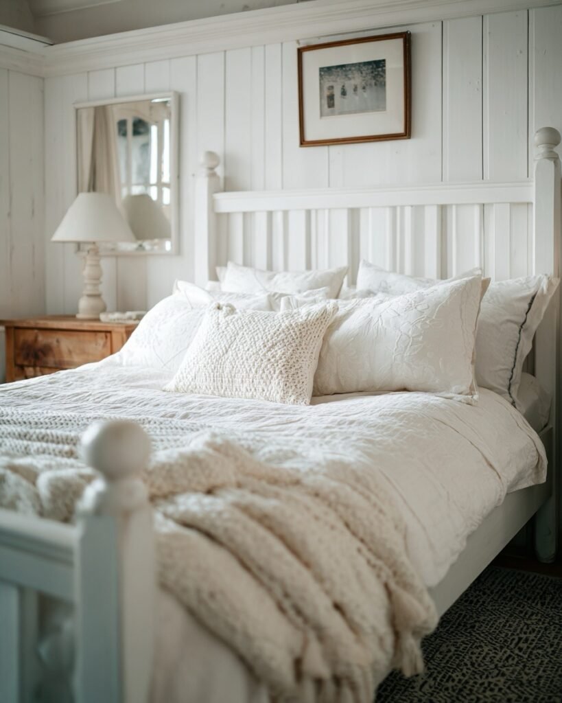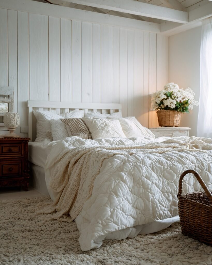 The master bedroom is calm and soft — the kind of room that makes you slow down without even trying. White shiplap walls, a simple wooden bed, and a thick quilt create a cozy, easy feel. “We didn’t go fancy,” Laura said. “Just comfortable.”