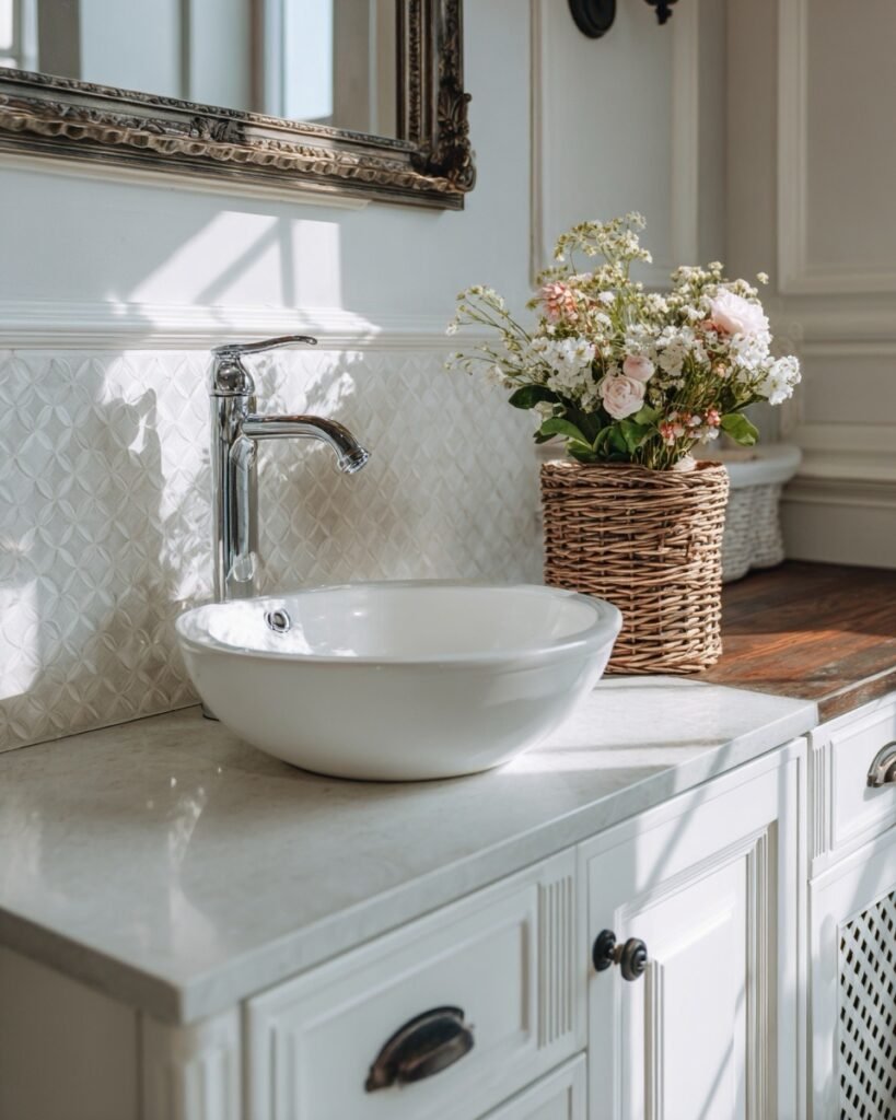 The bathroom is bright and charming — white cabinets, a round sink bowl, and a small basket of flowers that Laura changes every week. “It’s my little happy spot,” she said. “Every time I walk in, it feels fresh.”